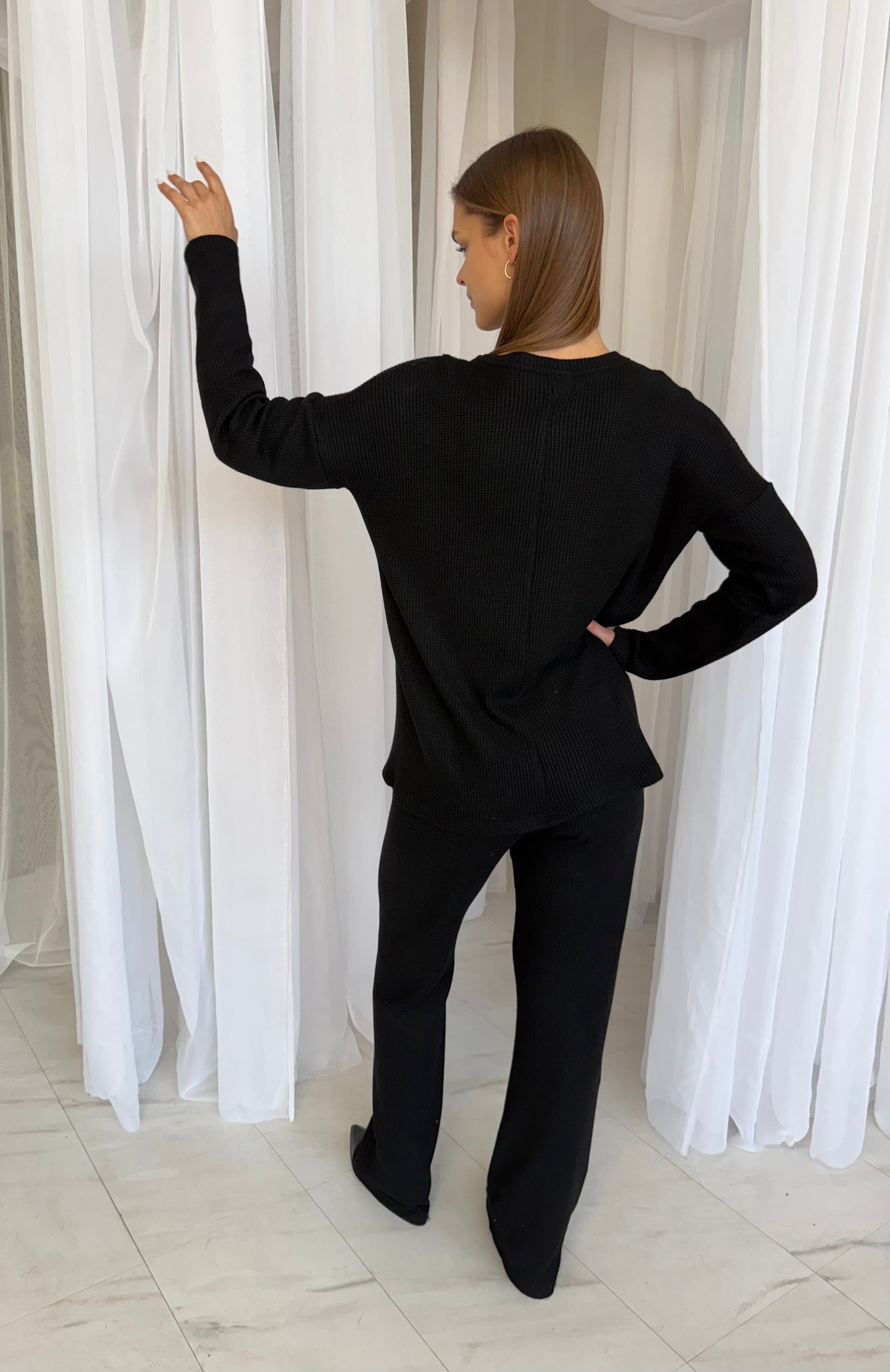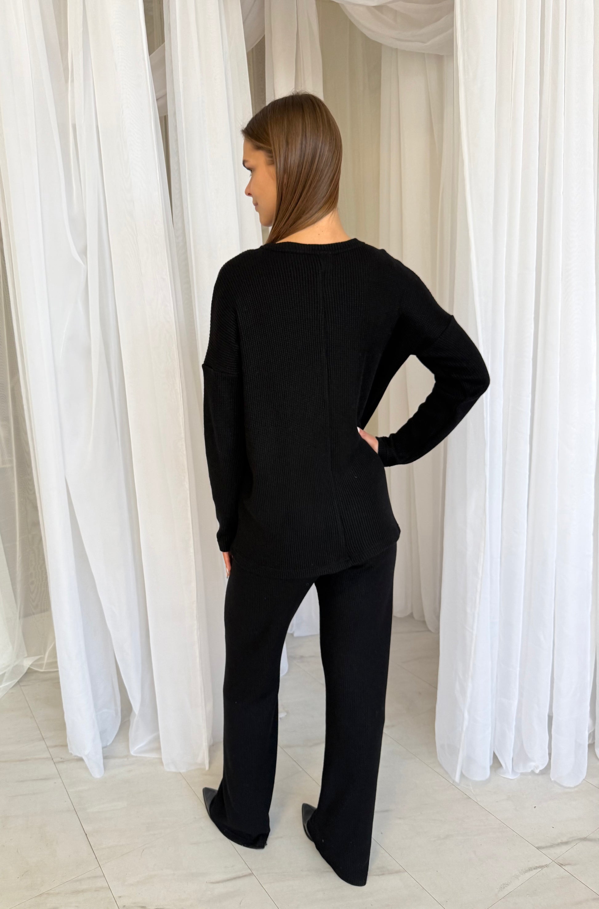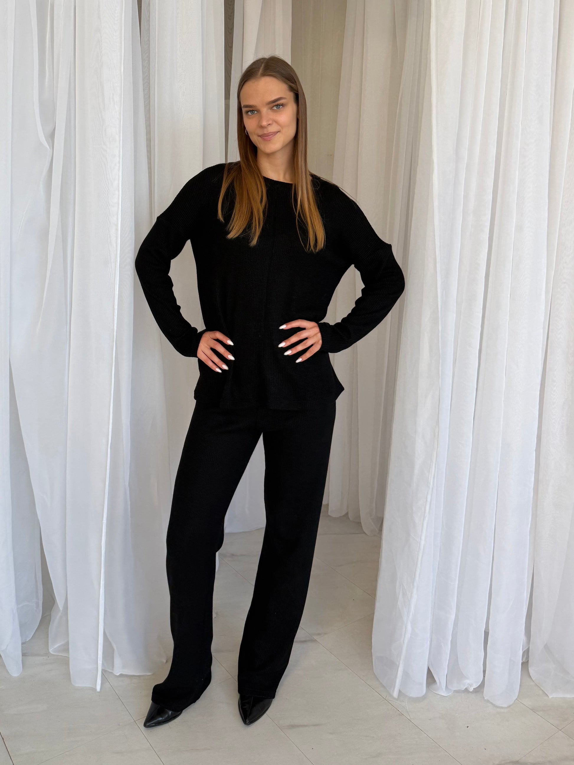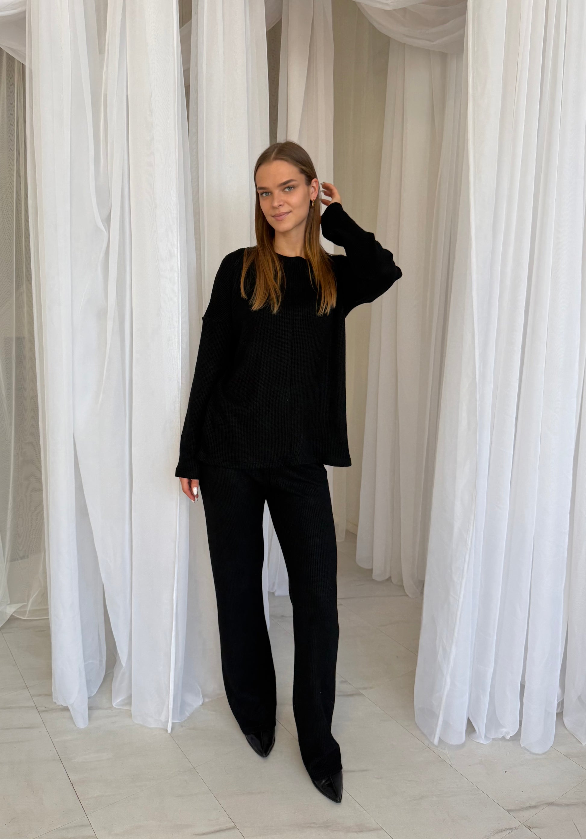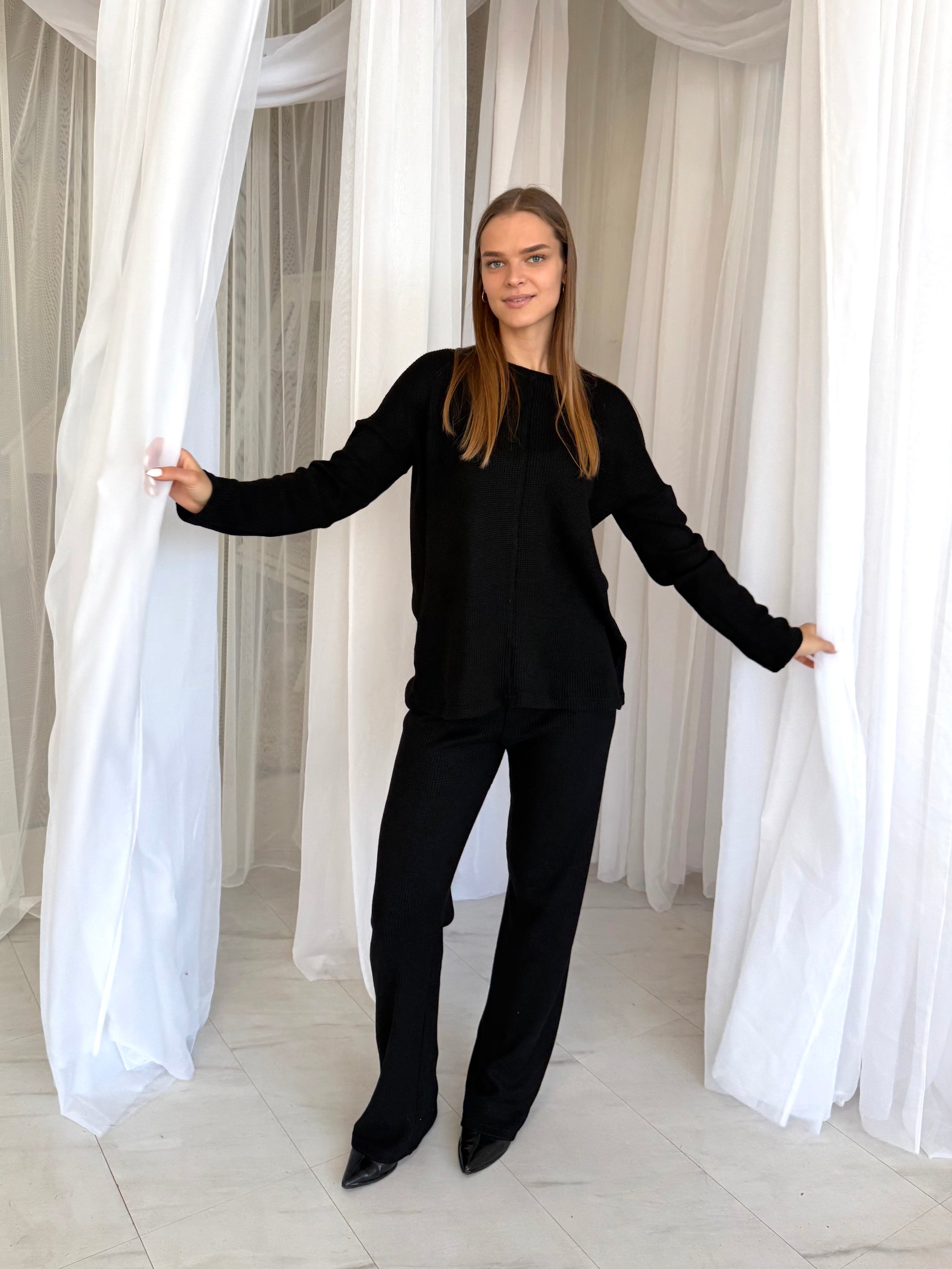 Palaidinė laisvo kritimo, pailginta, dengia užpakalį. Kelnės aukstu liemeniu, ties juosmeniu guma. Kelnės neturi šoninių siūlių, kas automatiškai tave ilgina ir lieknina kojas.