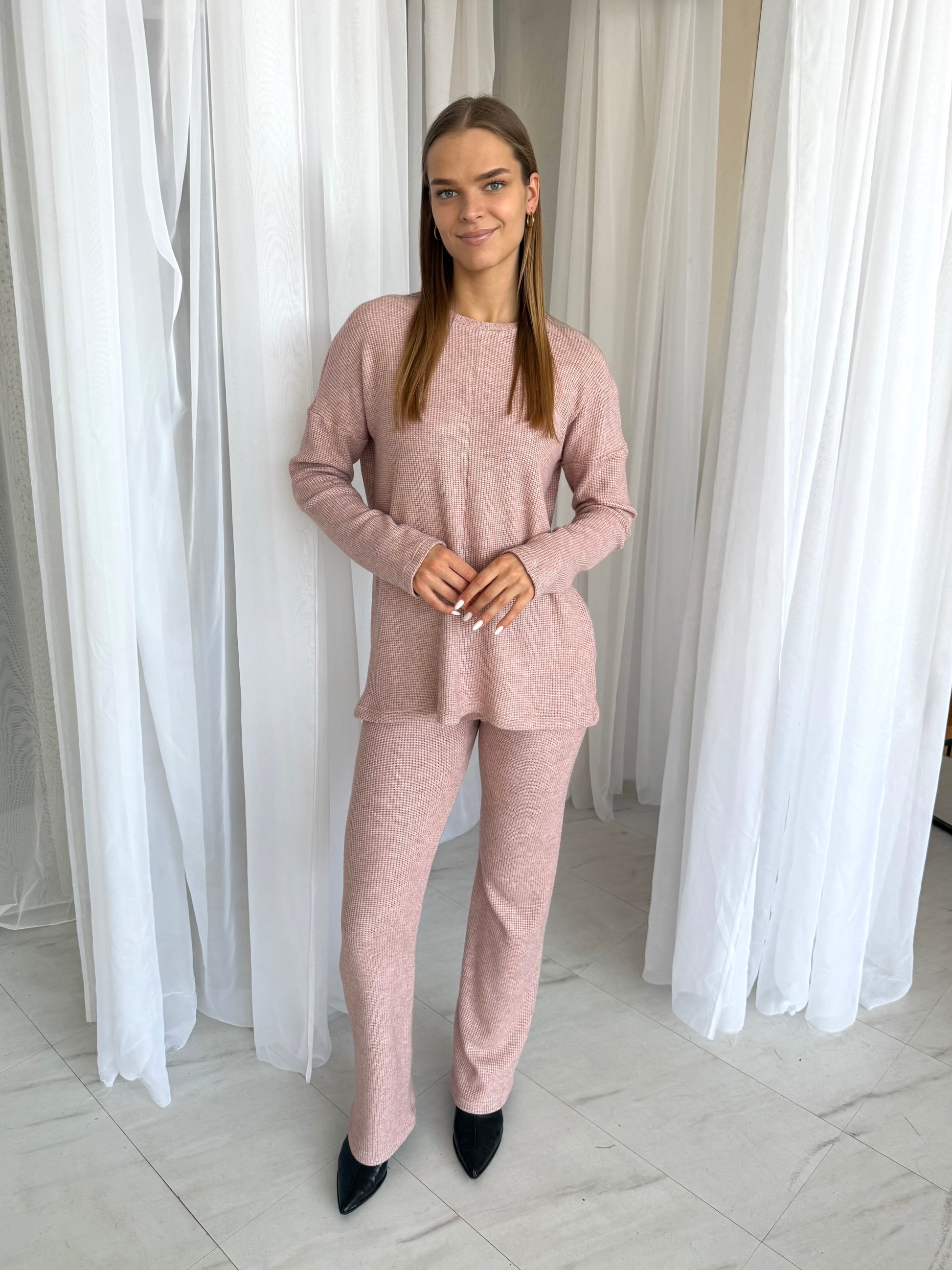 Megzto trikotažo laisvalaikio kostiumėlis. Rausvas