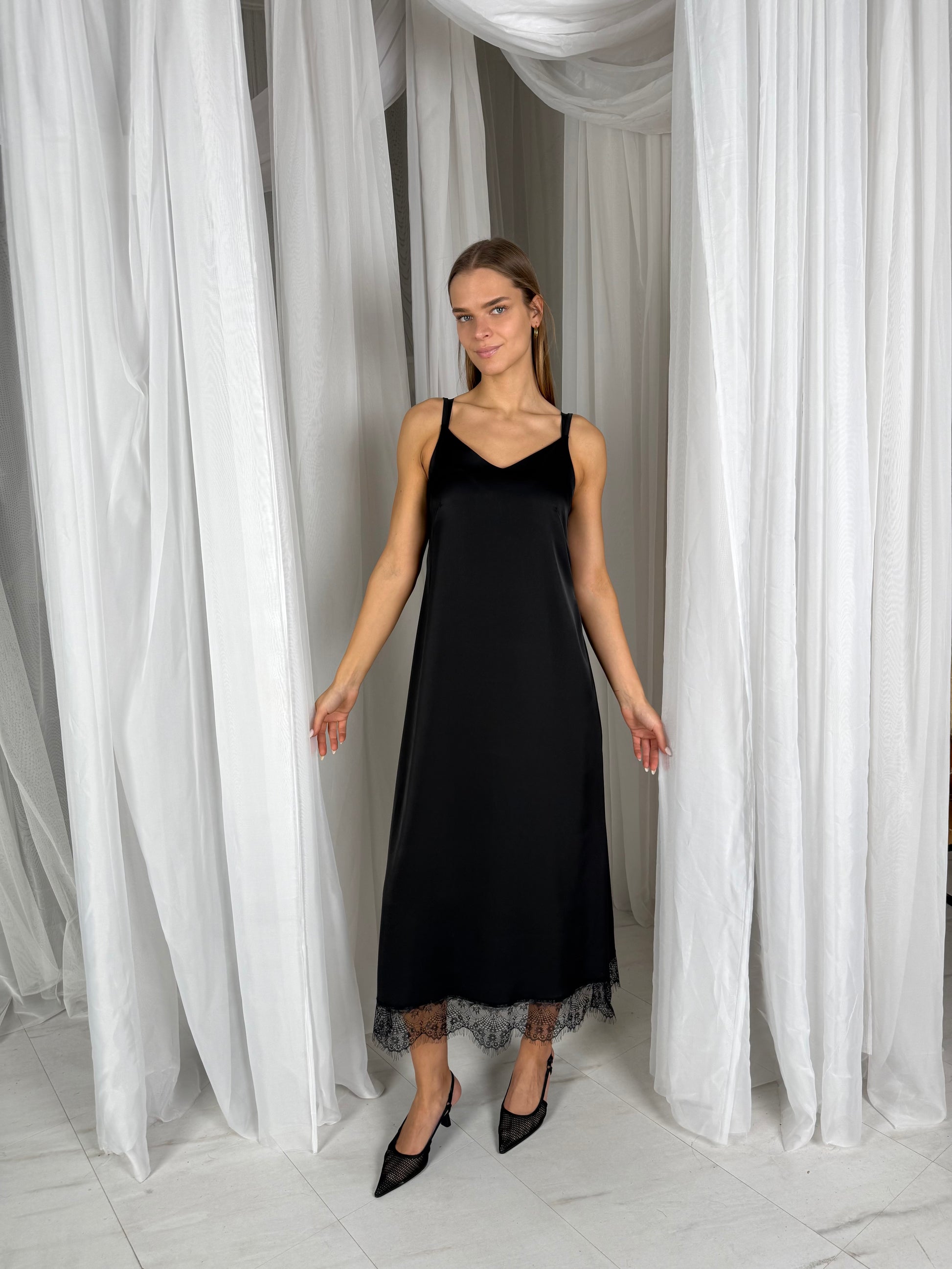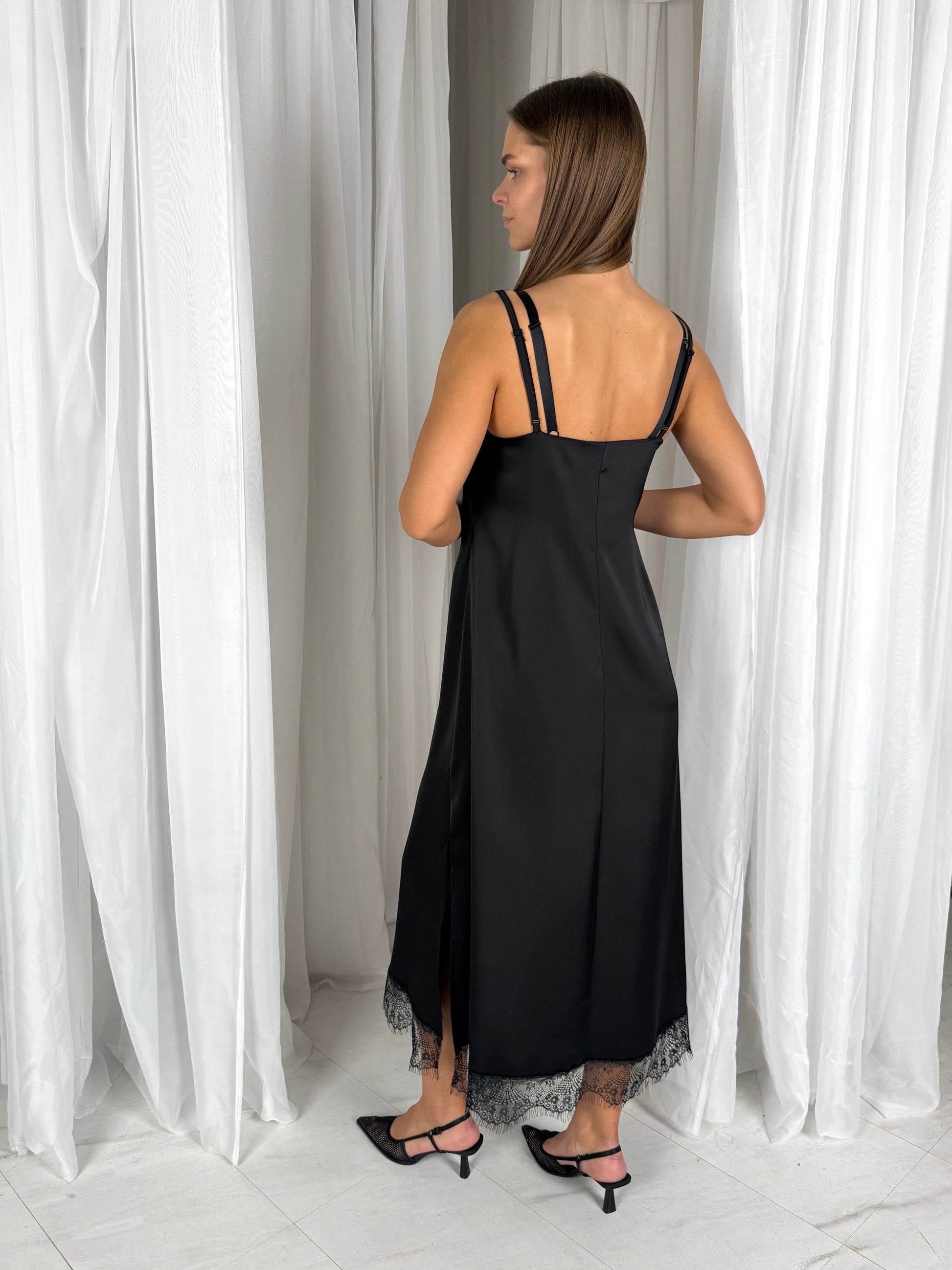 Prabangi SLIP suknelė su gipiūru. Juoda