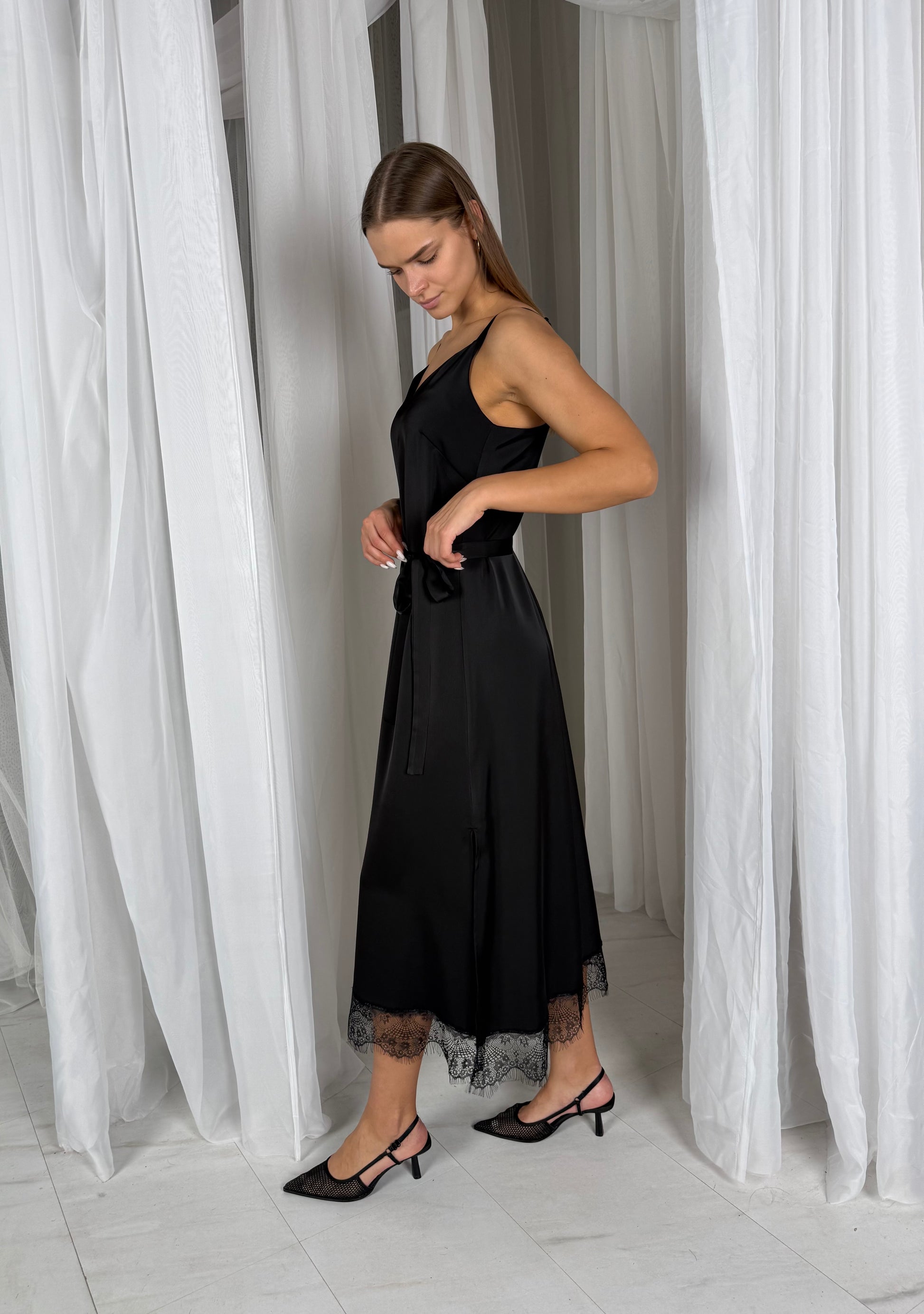 Atnaujinta SLIP suknelė, kurios apačioje prisiūta subtili gipiūro juostelė. Jį papildo suknelę ir suteikia prabangos jausmą. Atnaujintas modelis turi vieną gilesnį skeltuką šone, yra pailginta ir nuo klubų formuojamas minimalus varpelis.