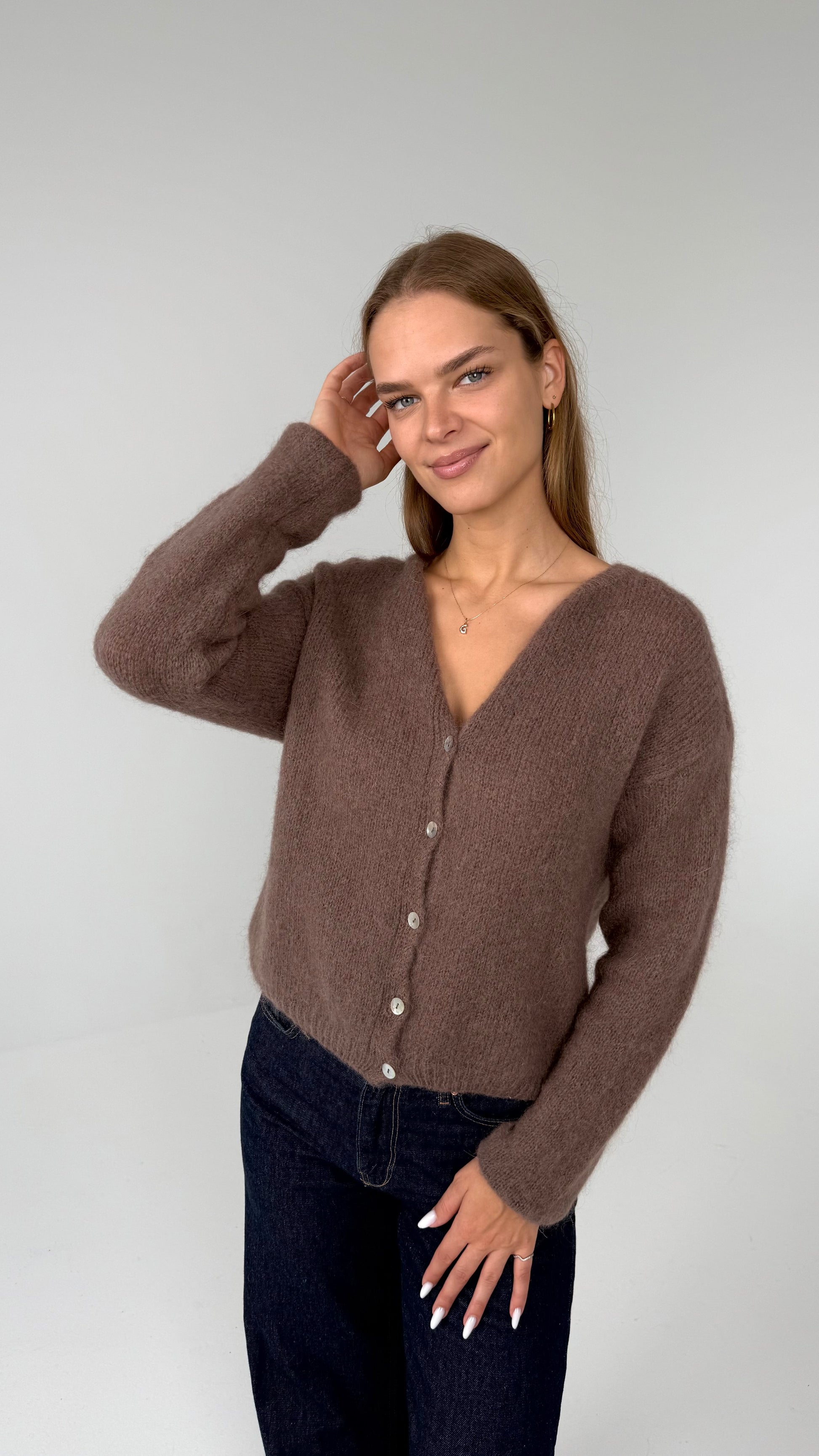 Megztinis nešiojamas susegamas pilnai arba atsegtas kaip kardiganas. Jei norisi V kaklo, reiktų atsegti dvi viršutines sagas ir megztinio atlapus užlengti į vidinę pusę.